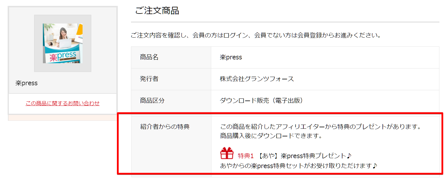 この紹介者から特典の欄に【あや】楽press特典プレゼント♪の表示がないと